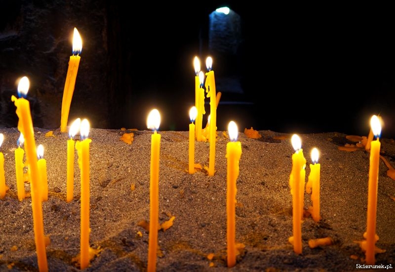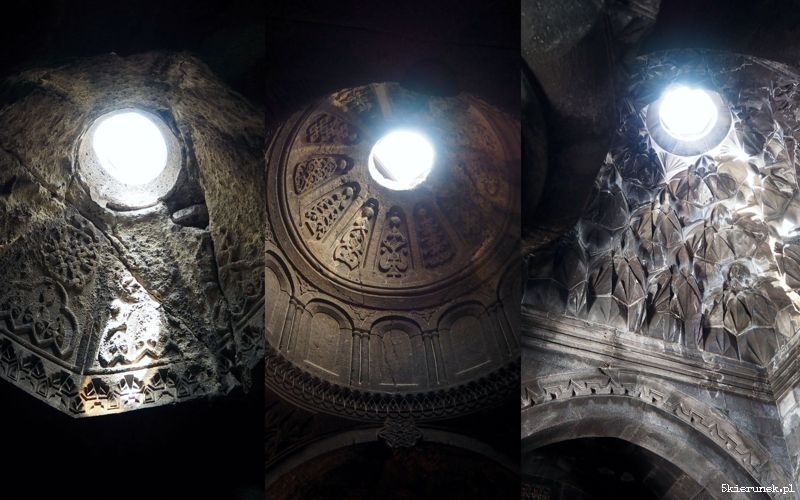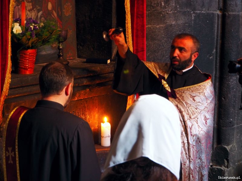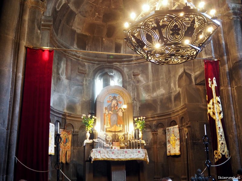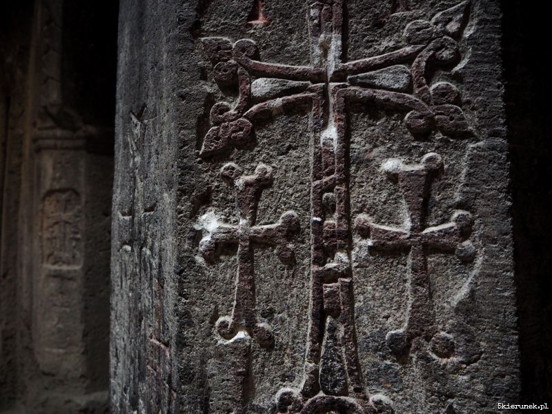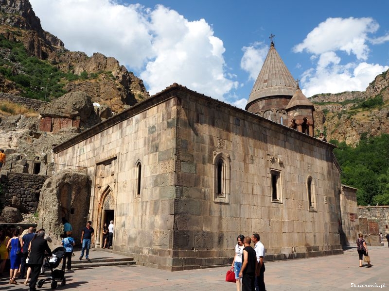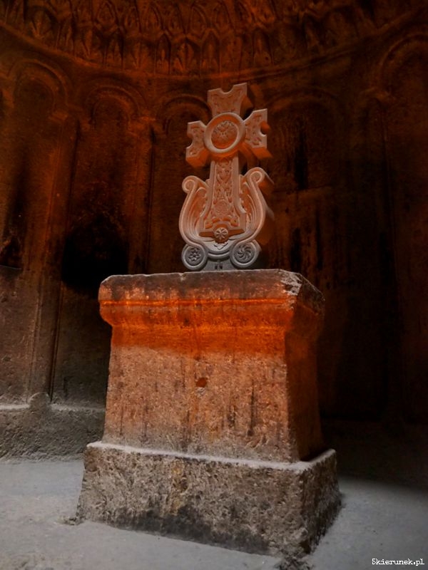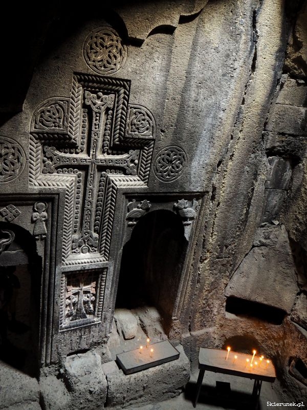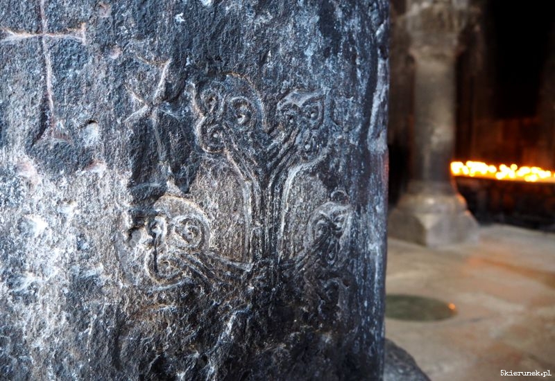 Na parkingu zwykłe zamieszanie, jak w każdym miejscu, do którego walnie przyjeżdżają turyści. Kramy pełne suwenirów i piękne ozdobionych gat – tradycyjnych ormiańskich ciast. Po przejściu głównej bramy, na dziedzińcu ludzie tłoczą się w kolejce do chrzcin, inni robią rodzinne zdjęcia, a wokół nich masa zwiedzających. Wtapiam się w nią. Nie dziwię się tłumowi. Poza rangą religijną i historyczną miejsca, Geghard usytuowany jest w niezwykłym miejscu, w otoczeniu skał, na prawym brzegu rzeki Azat. Kto potrafi zapomnieć o ludzkim tumulcie, może zakochać się w tym miejscu. Niespiesznie wchodzę do narteksu (w języku ormiańskim gavit). Zatapiam się w świetle padającym przez oculus. W chłodzie przestrzeni bijącej z wykutych skał, unosi się zapach palonych świec. Przenoszę się do innego świata.