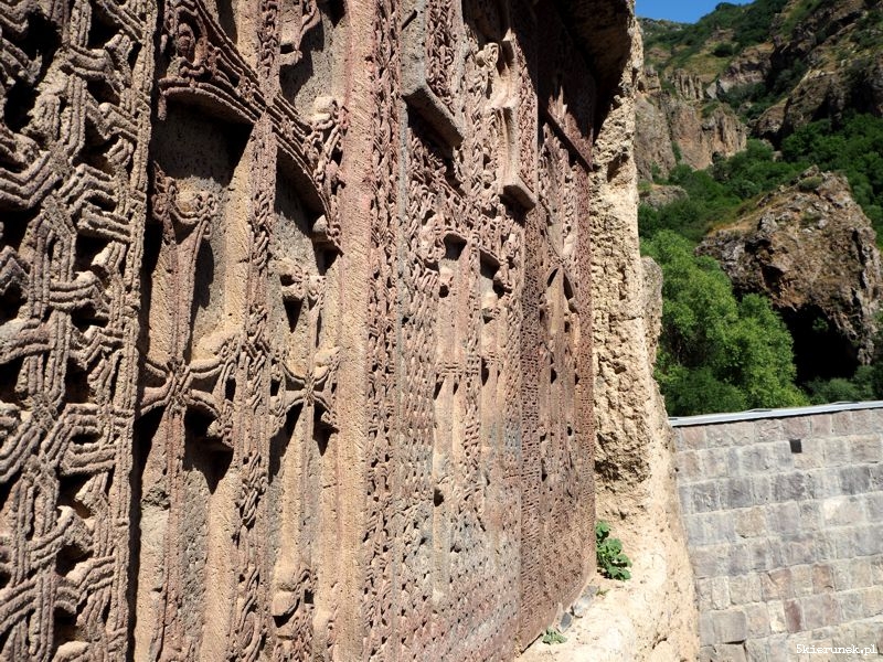 Wracamy na zewnątrz. Mijamy po lewej stronie kościół główny. Na południowej ścianie Kathoghikè znajduje się wejście i portal Surp Astvatsatsin (św. Matki Bożej). Tympanon zdobiony jest granatami, winogronami i innymi ornamentami oraz dwoma gołębiami. Nad portalem jest rzeźbiony lew atakujący woła, co ma symbolizować siłę Proshian. Mijamy kościół główny i kierujemy się na północ. W skale wkute są kaplice i piękne chaczkary. Stąd rozpościera się cudowny widok na okolicę.