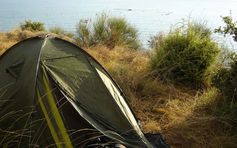 Odsypiamy nocny lot Kraków-Saloniki w namiocie, który stawiamy na klifie. Z jednej strony Olimp, z drugiej Morze Egejskie. Nie cieszymy się jednak pięknymi widokami, bowiem nad nami przewalają się ołowiane chmury. Ledwo rozbijamy namiot, a już Zeus ciska piorunami. Dzięki niemu kałuże w fartuchach przeciwśnieżnych wykorzystujemy do porannej kąpieli. Drogą pomiędzy gajami oliwnymi ruszamy do Litochoro.