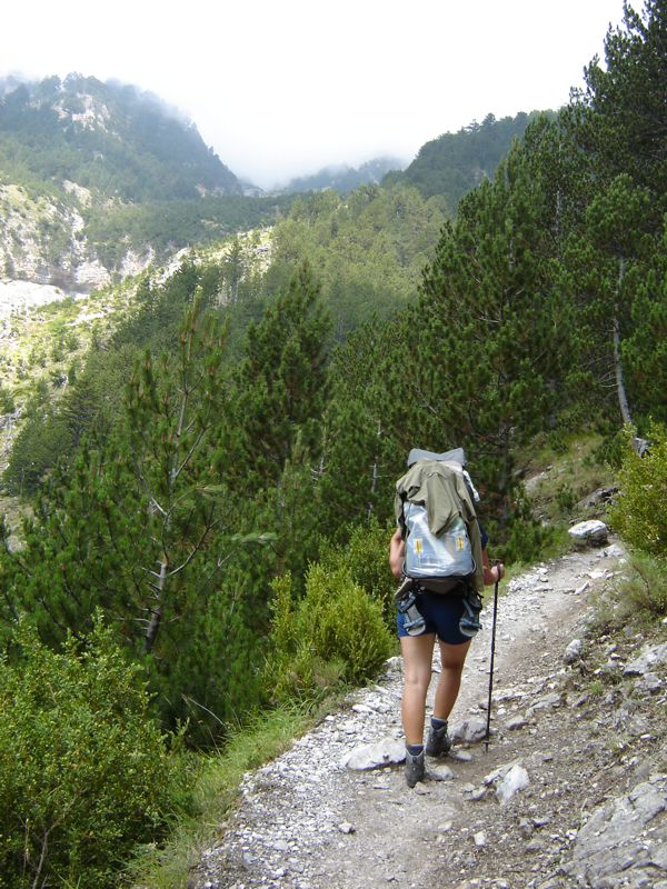 Poranek tradycyjny: jedzenie, pakowanie, składanie namiotu i w drogę. Jeszcze tylko schodzę po zapas wody, bo z wodą na Olimpie jest krucho. Podejście do schroniska A „Spilios Agapitos” (2100 m) zajmuje nam ponad 5 godzin (standardowo jest 2-3 godziny). Ciągle towarzyszy nam pytanie: daleko jeszcze? Co chwilę przystajemy, by Mikołaj mógł rozprostować nogi, a my dajemy odpocząć naszym objuczonym plecom, co wydaje się całkiem normalnym zachowaniem, kiedy się uzmysłowi, że Beata niesie ponad 16 kg, a ja prawie 30 kg, niczym dobrzy Szerpowie.
